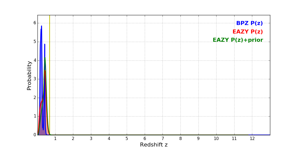 In P(z) plots: Yellow lines mark the cluster redshift z = 0.677,