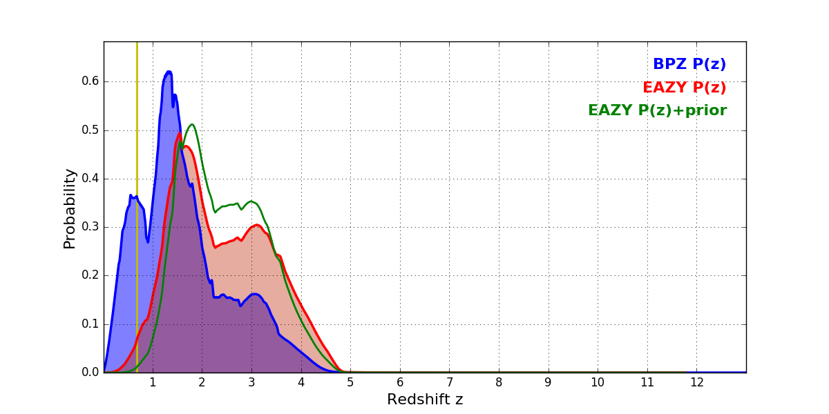 In P(z) plots: Yellow lines mark the cluster redshift z = 0.677,