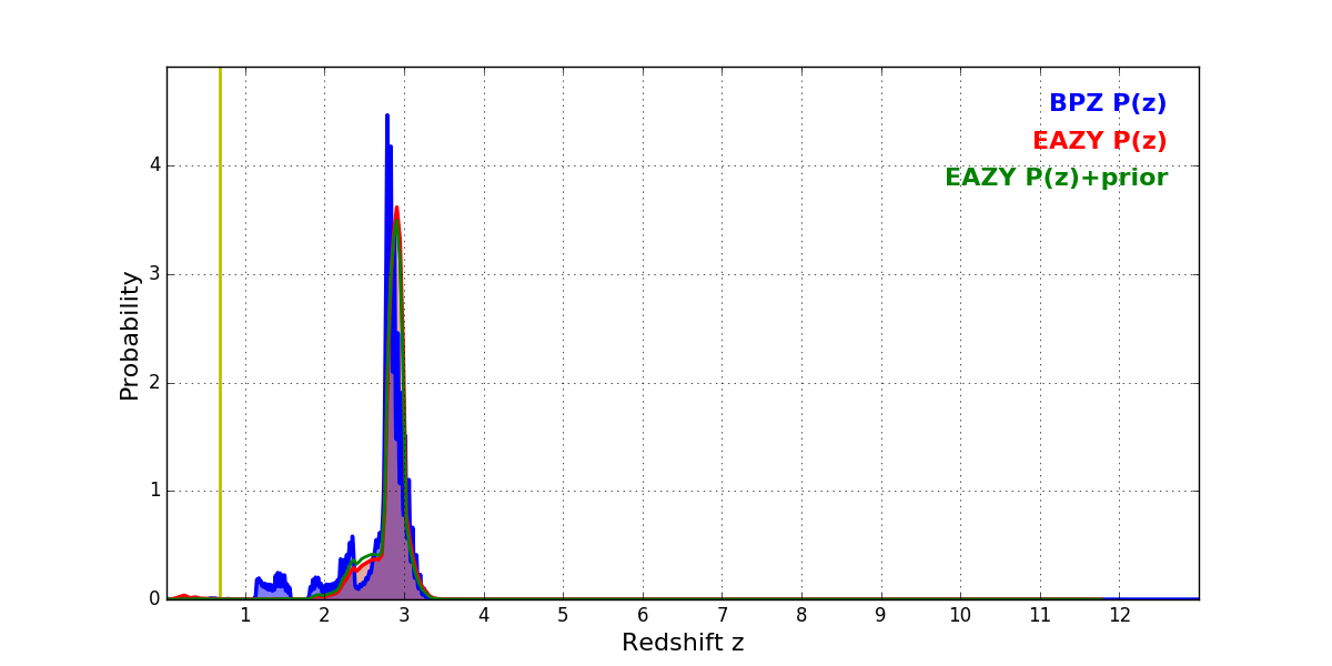 In P(z) plots: Yellow lines mark the cluster redshift z = 0.677,