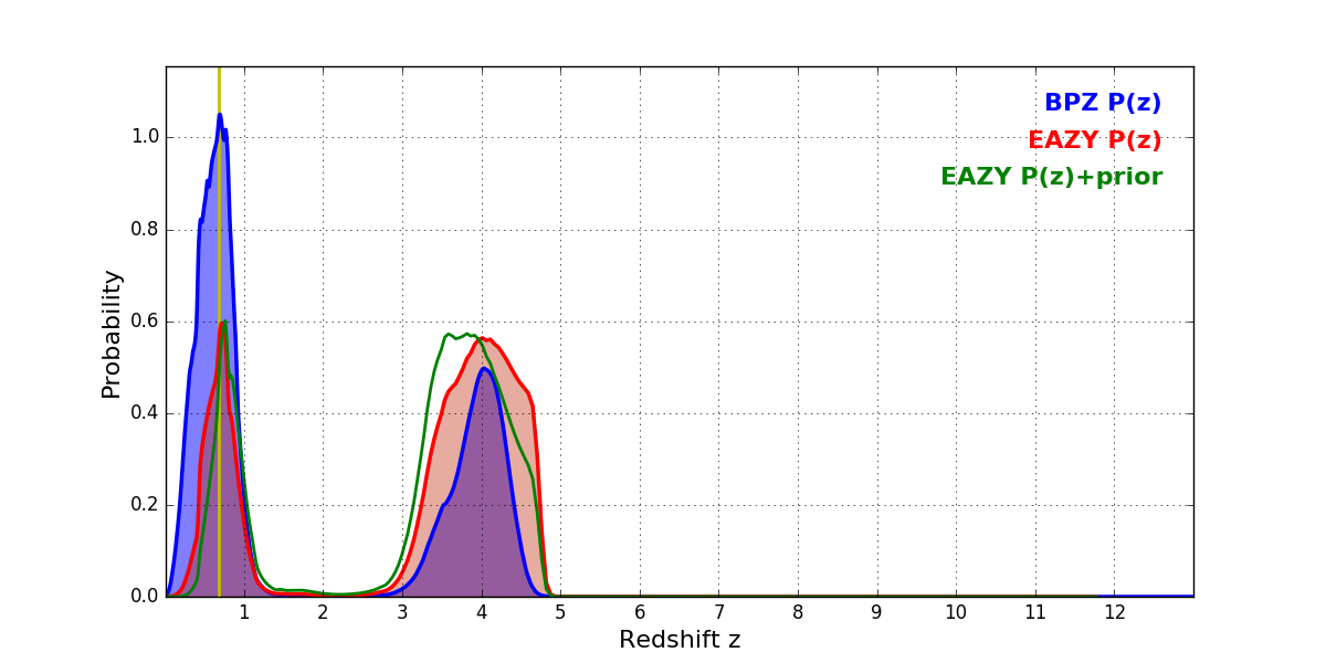 In P(z) plots: Yellow lines mark the cluster redshift z = 0.677,