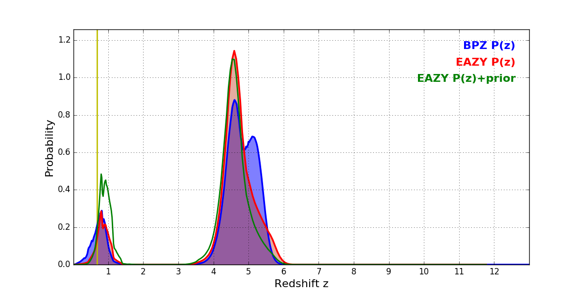 In P(z) plots: Yellow lines mark the cluster redshift z = 0.677,