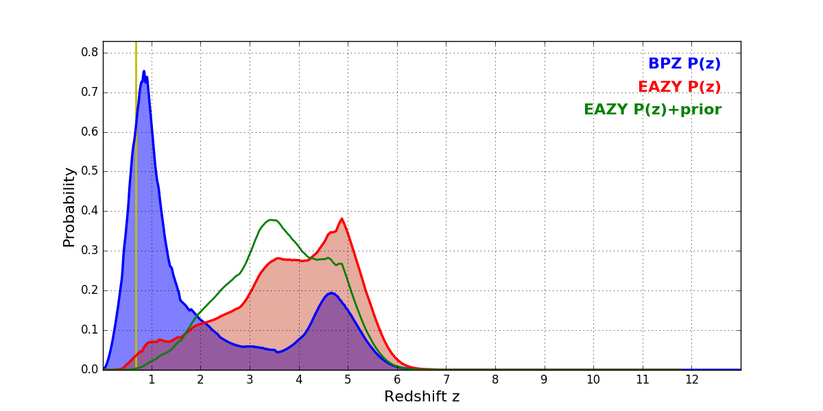 In P(z) plots: Yellow lines mark the cluster redshift z = 0.677,