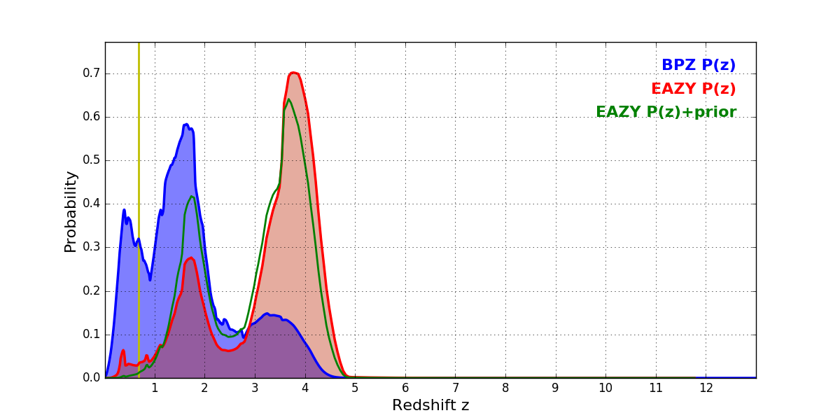 In P(z) plots: Yellow lines mark the cluster redshift z = 0.677,