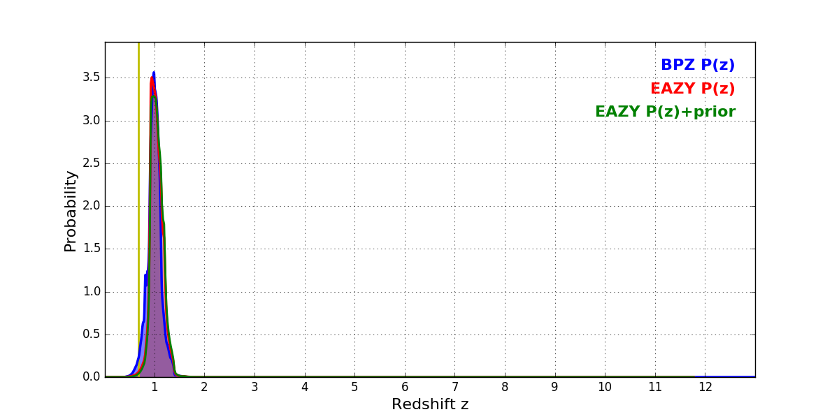 In P(z) plots: Yellow lines mark the cluster redshift z = 0.677,