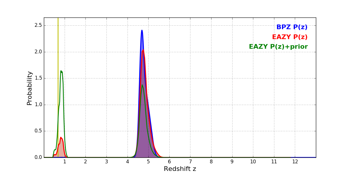 In P(z) plots: Yellow lines mark the cluster redshift z = 0.677,