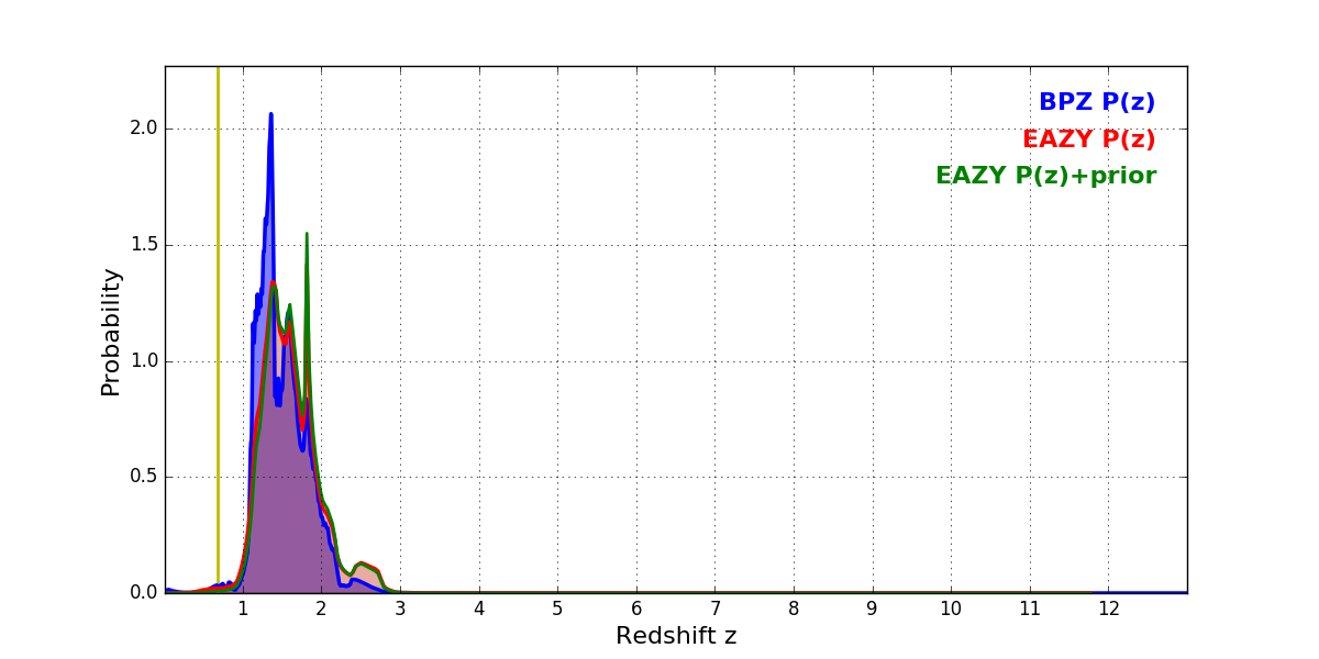 In P(z) plots: Yellow lines mark the cluster redshift z = 0.677,
