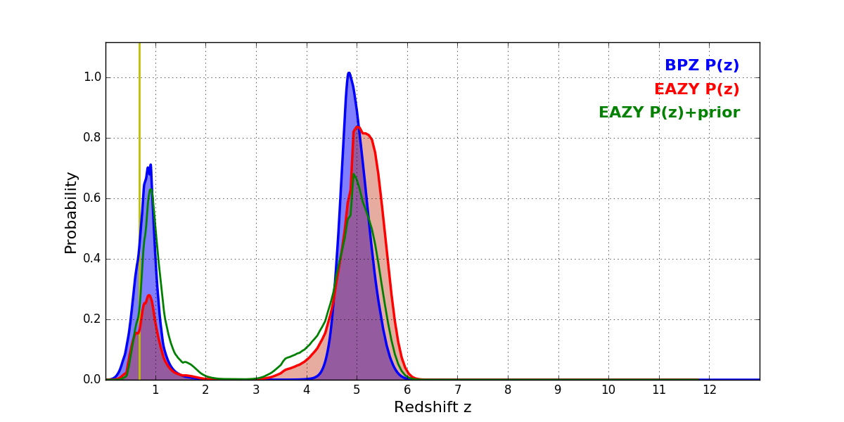 In P(z) plots: Yellow lines mark the cluster redshift z = 0.677,