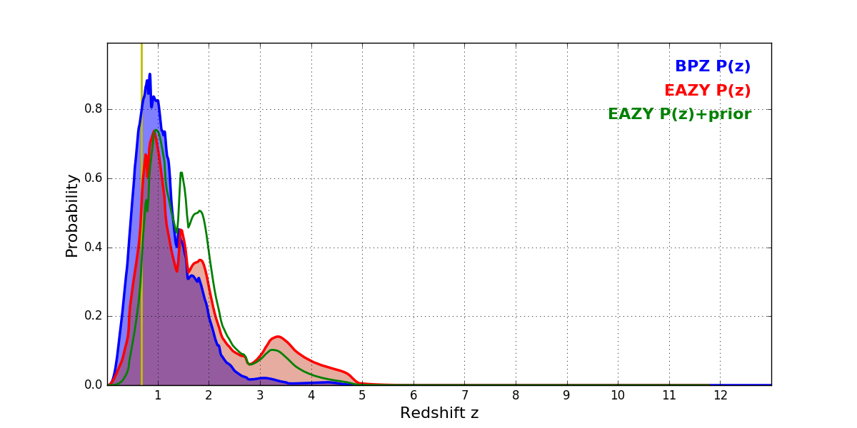 In P(z) plots: Yellow lines mark the cluster redshift z = 0.677,