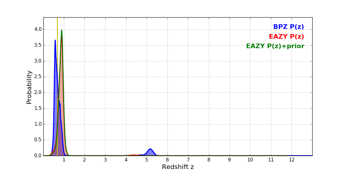 In P(z) plots: Yellow lines mark the cluster redshift z = 0.677,