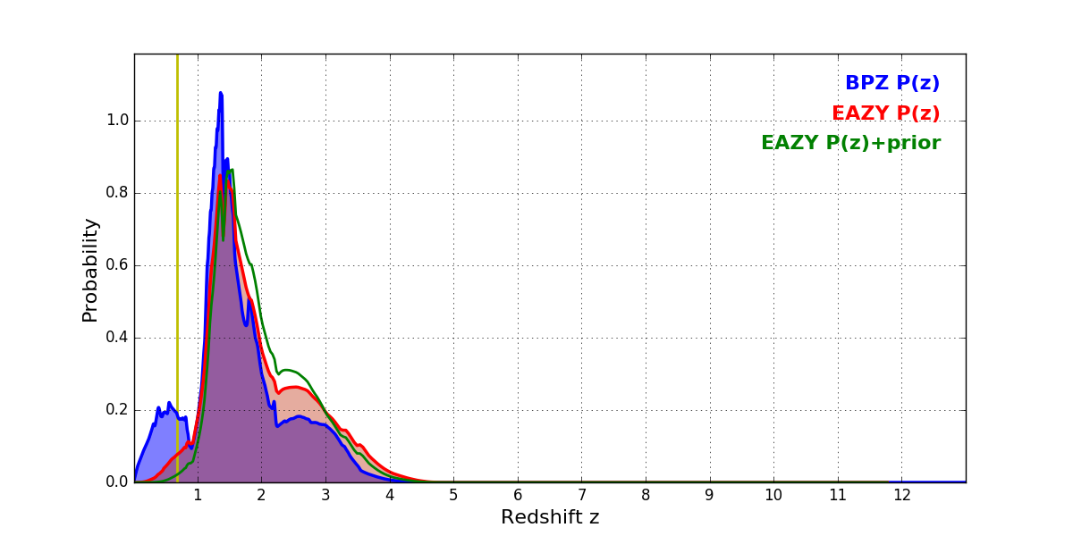 In P(z) plots: Yellow lines mark the cluster redshift z = 0.677,