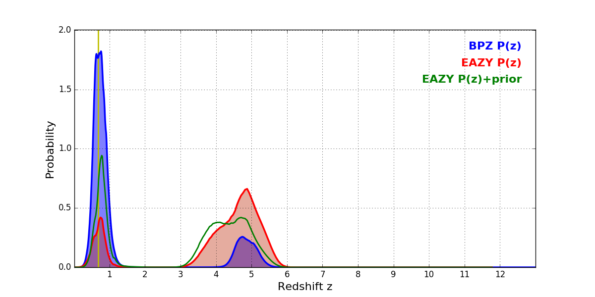 In P(z) plots: Yellow lines mark the cluster redshift z = 0.677,