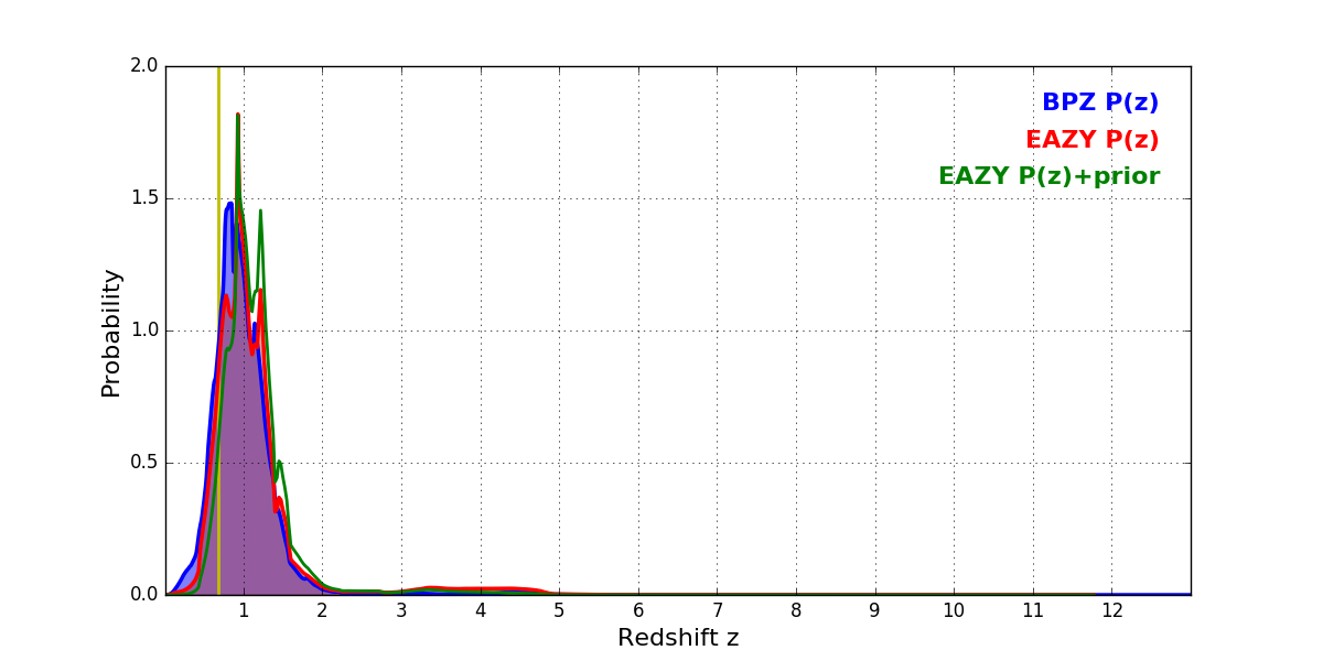 In P(z) plots: Yellow lines mark the cluster redshift z = 0.677,