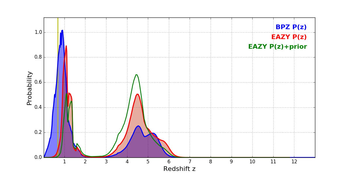 In P(z) plots: Yellow lines mark the cluster redshift z = 0.677,