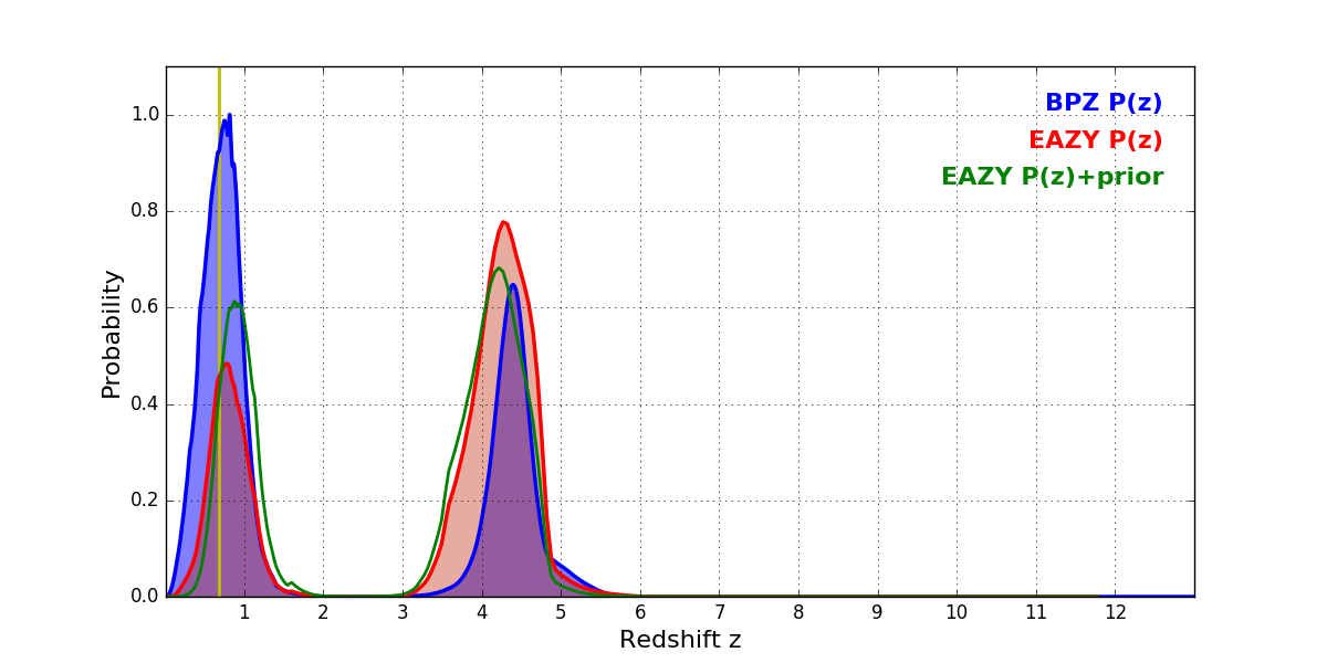 In P(z) plots: Yellow lines mark the cluster redshift z = 0.677,