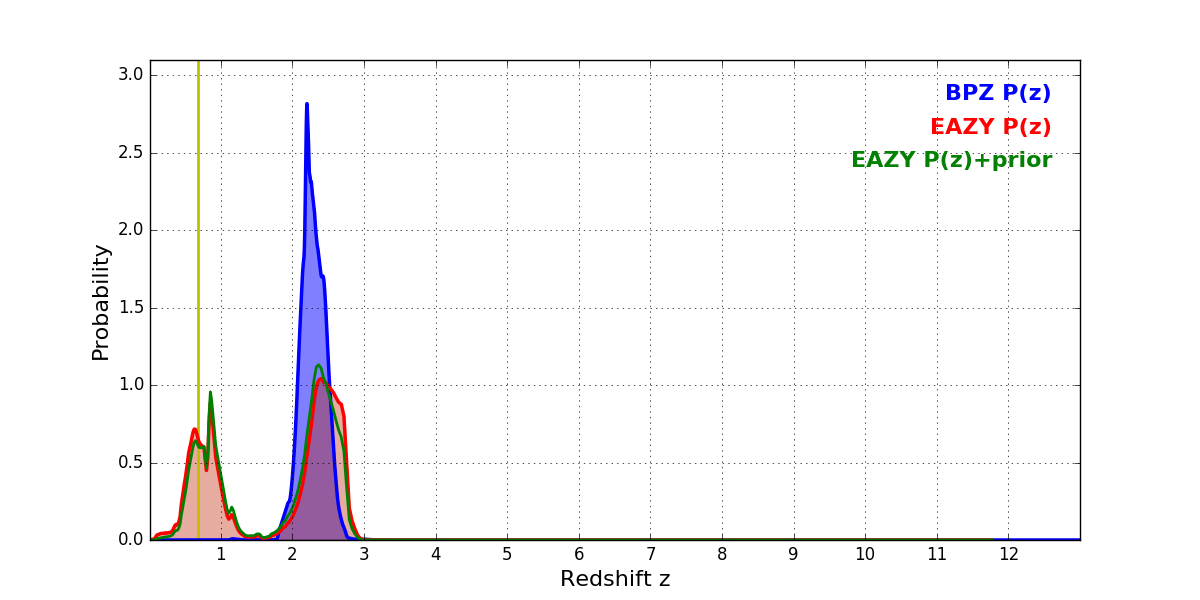 In P(z) plots: Yellow lines mark the cluster redshift z = 0.677,