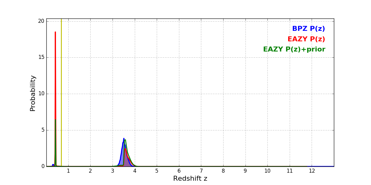 In P(z) plots: Yellow lines mark the cluster redshift z = 0.677,