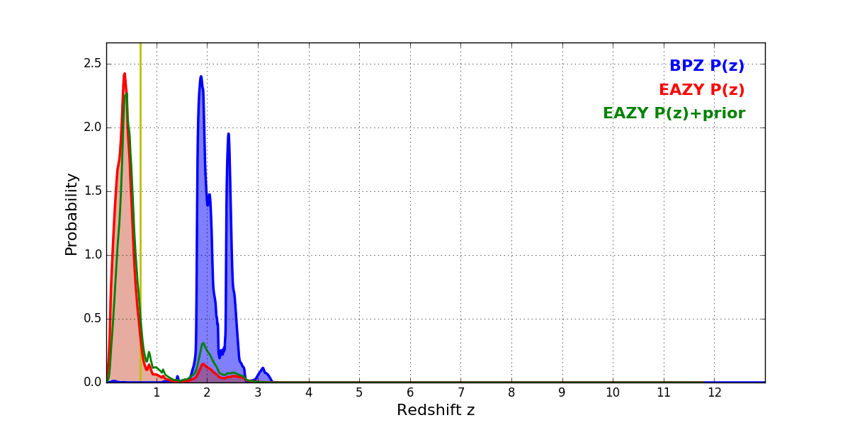 In P(z) plots: Yellow lines mark the cluster redshift z = 0.677,