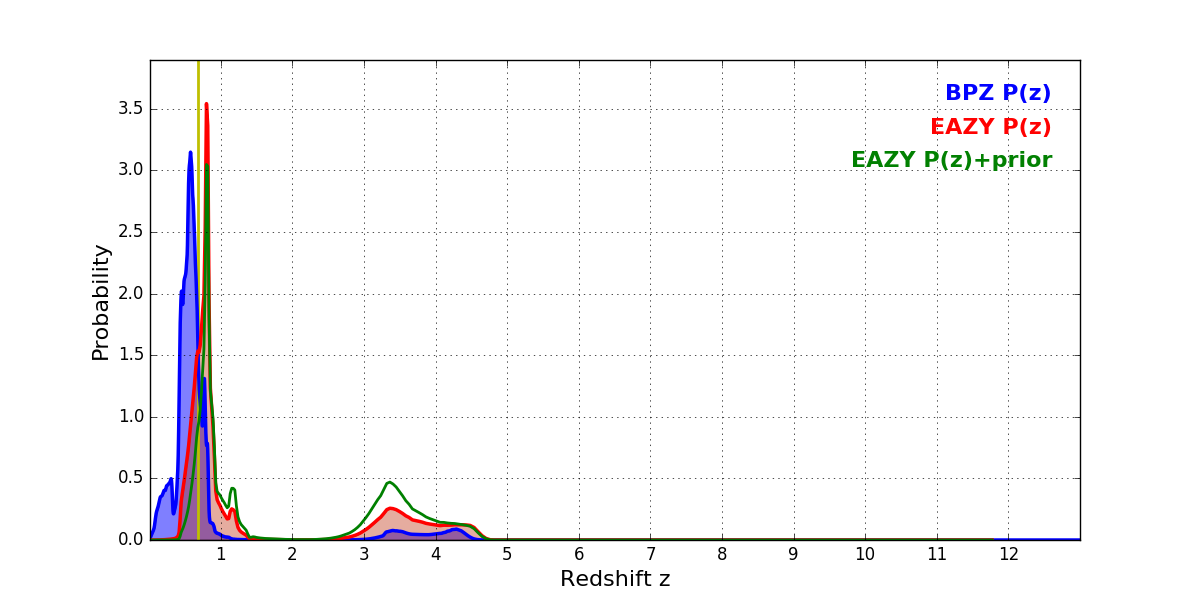 In P(z) plots: Yellow lines mark the cluster redshift z = 0.677,