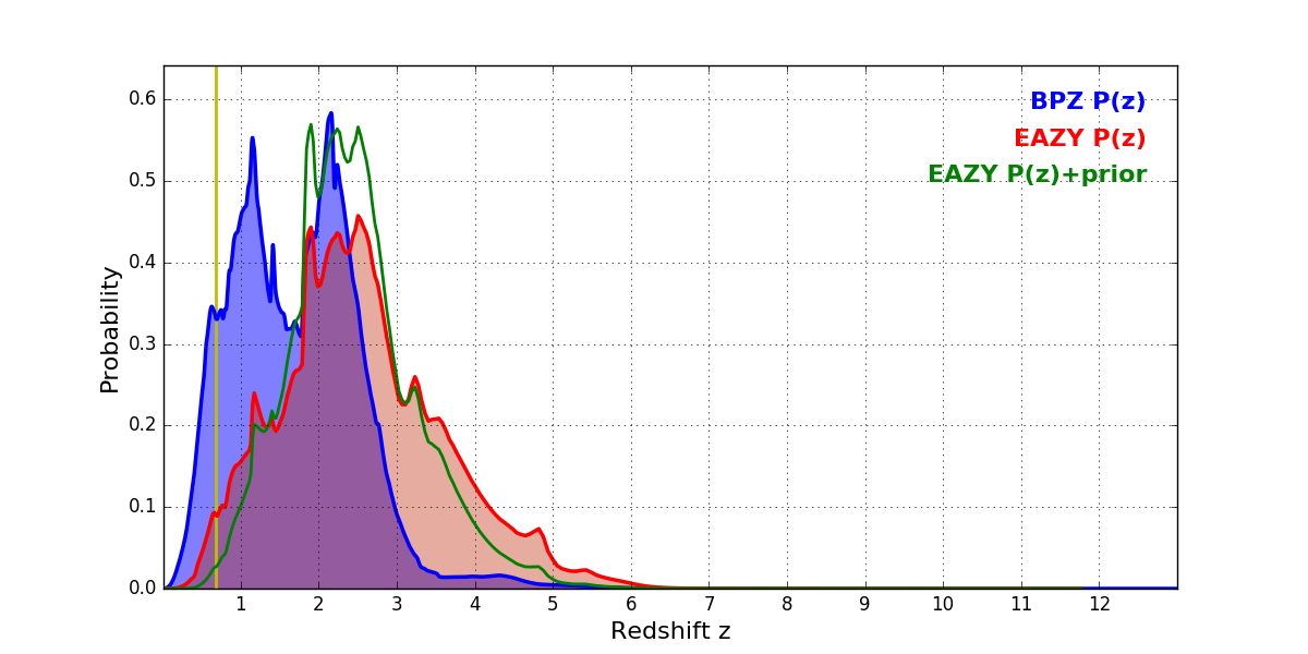 In P(z) plots: Yellow lines mark the cluster redshift z = 0.677,