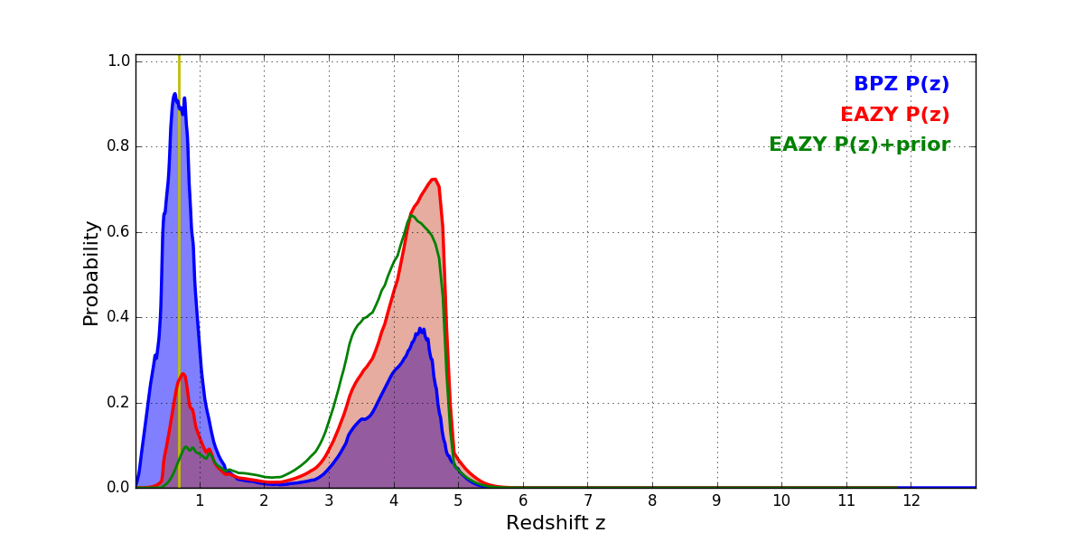 In P(z) plots: Yellow lines mark the cluster redshift z = 0.677,