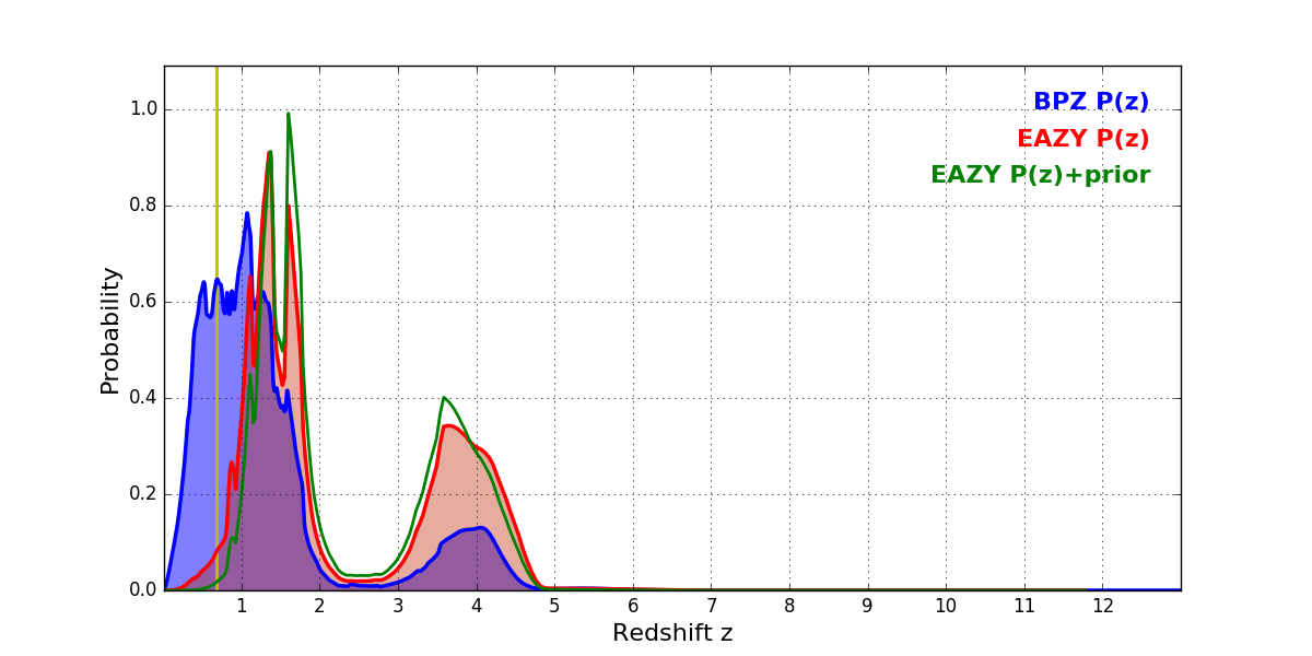 In P(z) plots: Yellow lines mark the cluster redshift z = 0.677,