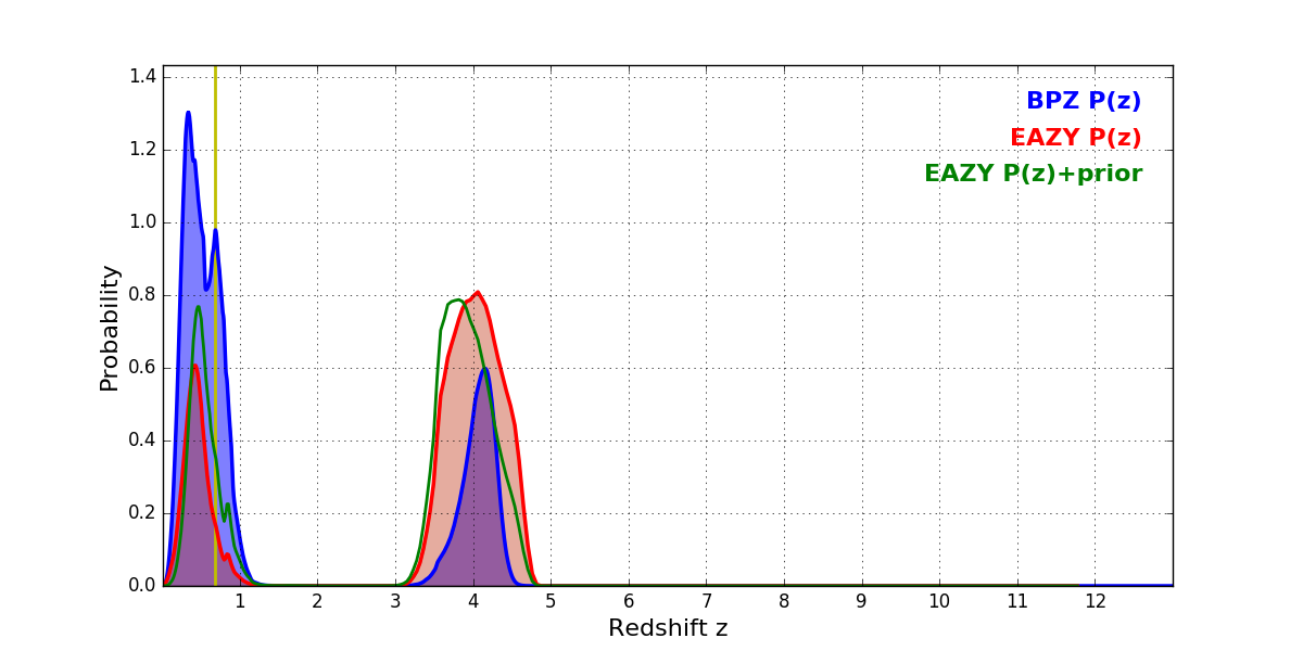 In P(z) plots: Yellow lines mark the cluster redshift z = 0.677,
