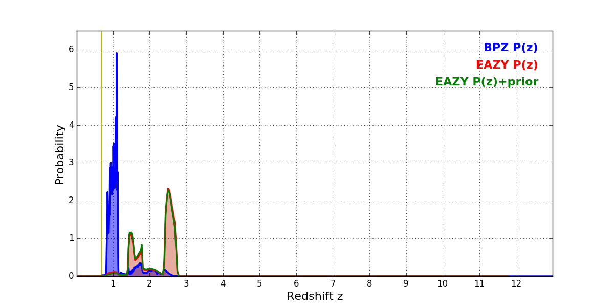 In P(z) plots: Yellow lines mark the cluster redshift z = 0.677,