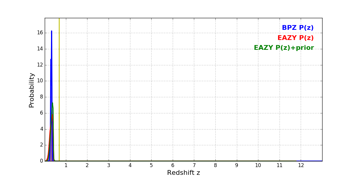 In P(z) plots: Yellow lines mark the cluster redshift z = 0.677,