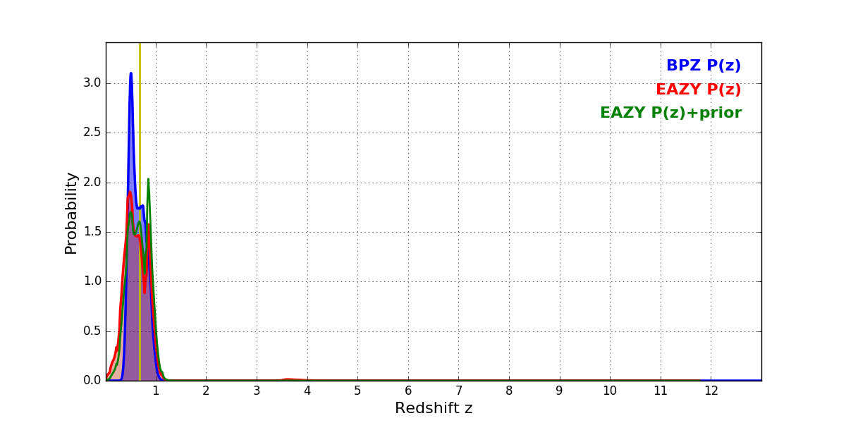 In P(z) plots: Yellow lines mark the cluster redshift z = 0.677,