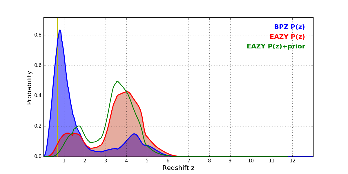 In P(z) plots: Yellow lines mark the cluster redshift z = 0.677,
