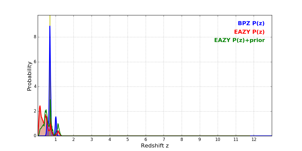 In P(z) plots: Yellow lines mark the cluster redshift z = 0.677,
