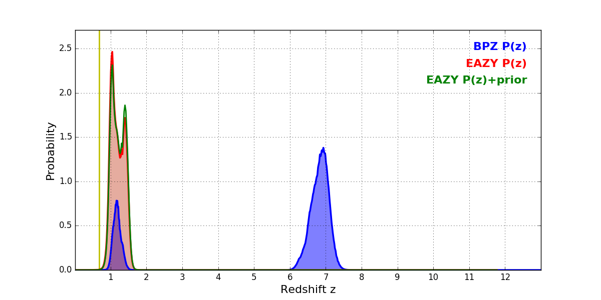 In P(z) plots: Yellow lines mark the cluster redshift z = 0.677,