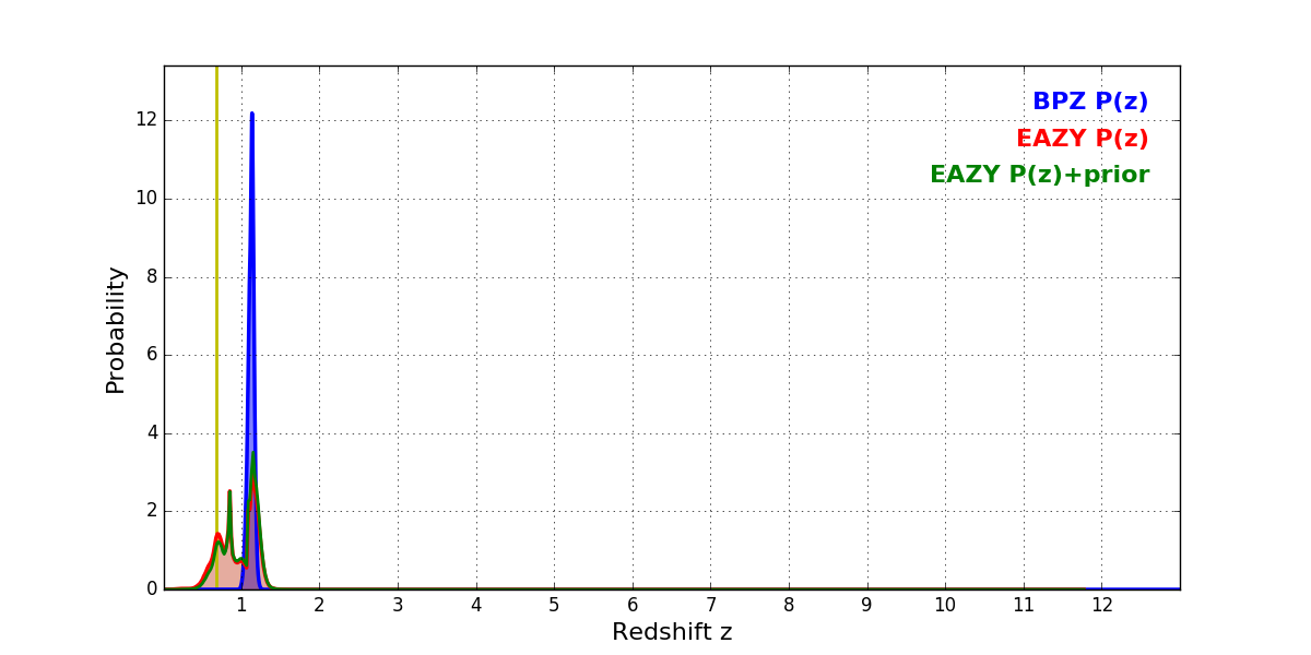 In P(z) plots: Yellow lines mark the cluster redshift z = 0.677,