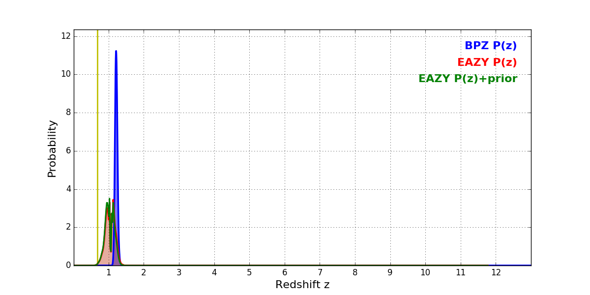 In P(z) plots: Yellow lines mark the cluster redshift z = 0.677,