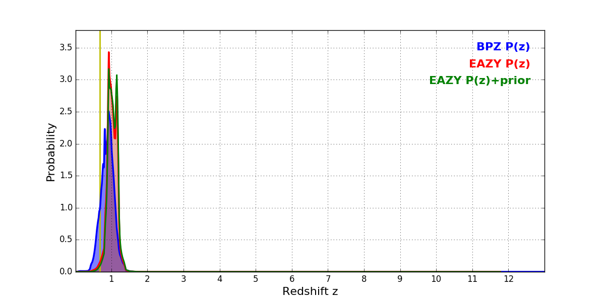 In P(z) plots: Yellow lines mark the cluster redshift z = 0.677,