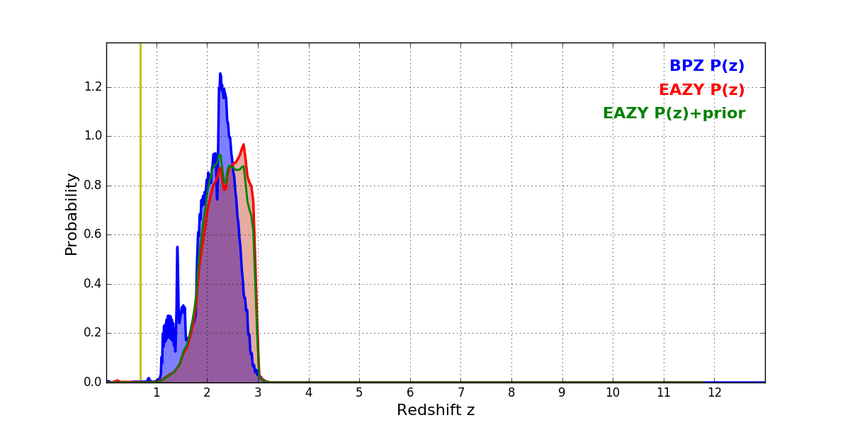 In P(z) plots: Yellow lines mark the cluster redshift z = 0.677,