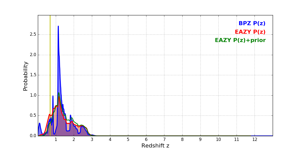 In P(z) plots: Yellow lines mark the cluster redshift z = 0.677,