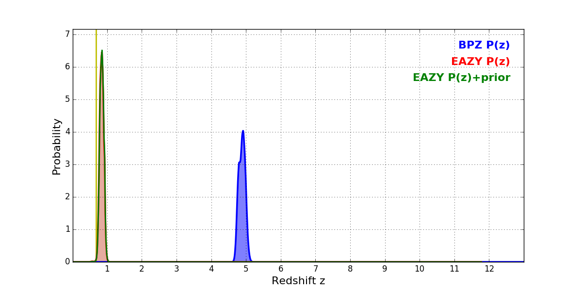 In P(z) plots: Yellow lines mark the cluster redshift z = 0.677,