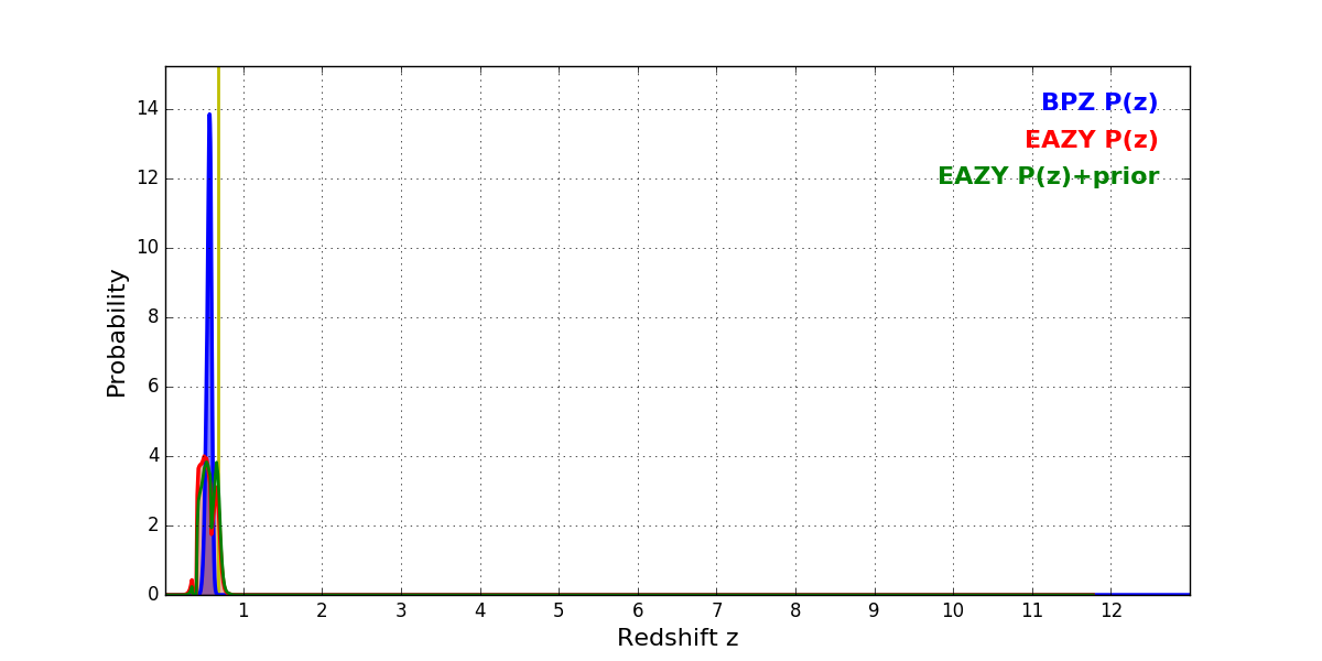 In P(z) plots: Yellow lines mark the cluster redshift z = 0.677,