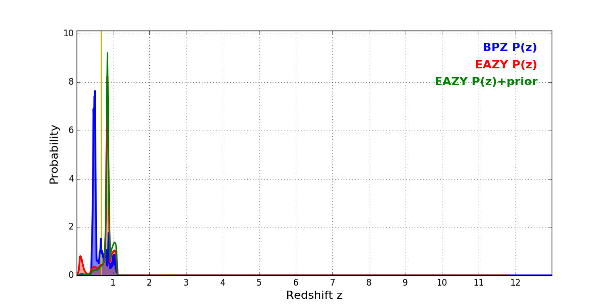 In P(z) plots: Yellow lines mark the cluster redshift z = 0.677,