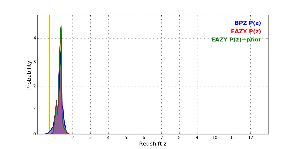 In P(z) plots: Yellow lines mark the cluster redshift z = 0.677,