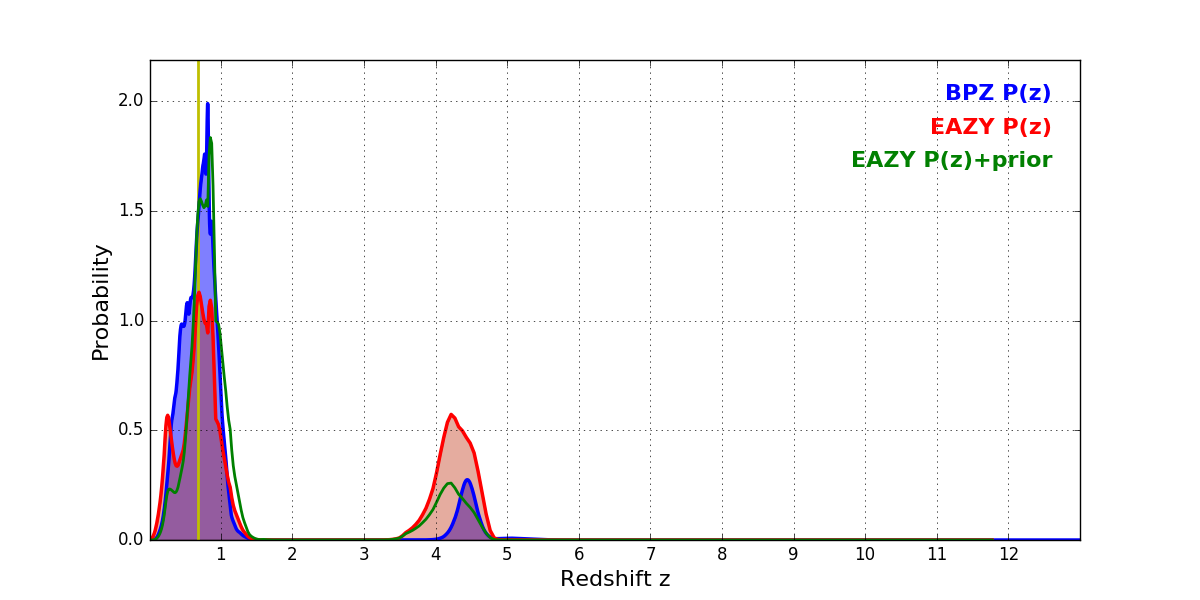 In P(z) plots: Yellow lines mark the cluster redshift z = 0.677,