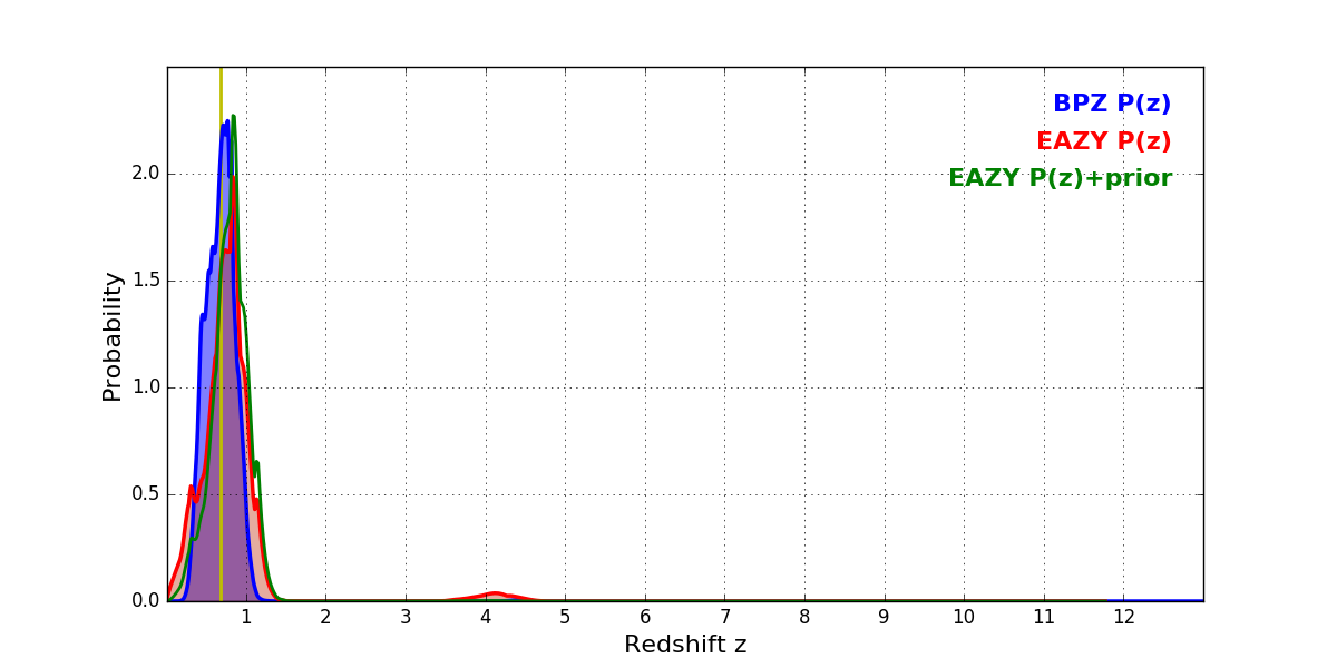 In P(z) plots: Yellow lines mark the cluster redshift z = 0.677,