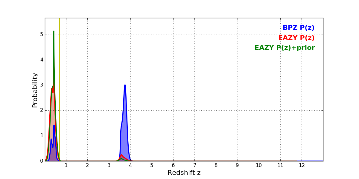 In P(z) plots: Yellow lines mark the cluster redshift z = 0.677,