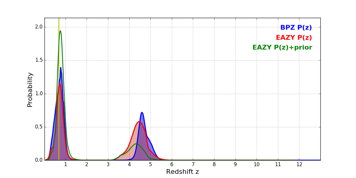 In P(z) plots: Yellow lines mark the cluster redshift z = 0.677,