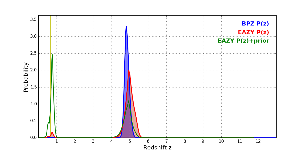 In P(z) plots: Yellow lines mark the cluster redshift z = 0.677,