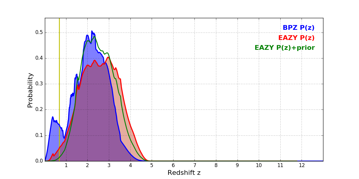 In P(z) plots: Yellow lines mark the cluster redshift z = 0.677,