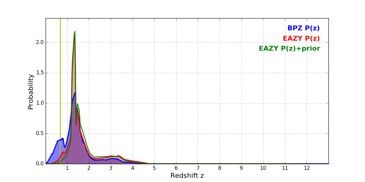 In P(z) plots: Yellow lines mark the cluster redshift z = 0.677,