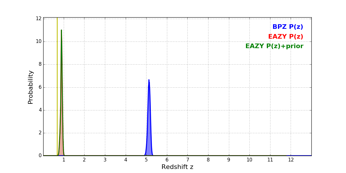 In P(z) plots: Yellow lines mark the cluster redshift z = 0.677,