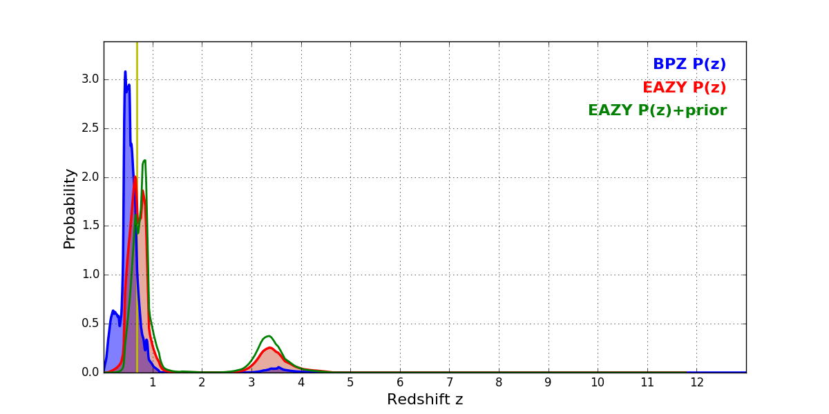 In P(z) plots: Yellow lines mark the cluster redshift z = 0.677,